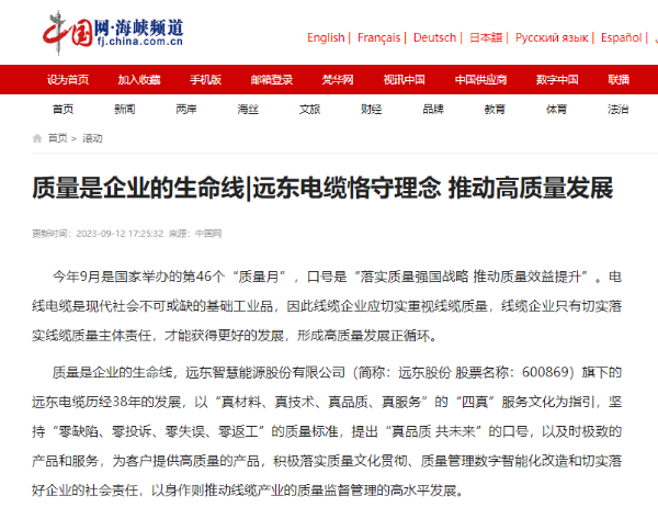 前不久,为深入贯彻落实党中央、国务院关于建设质量强国的重大决策部署,响应国家市场监督管理总局“全国质量月”号召,betway手机地址 组织各部门、生产厂以“用‘匠心、绿芯、温馨’为远东品质护航!”为主题共同开展“质量月”活动,打造共建共治共享质量工作格局,践行高质量发展正循环战略要求。受到中国网等多家媒体点赞报导。